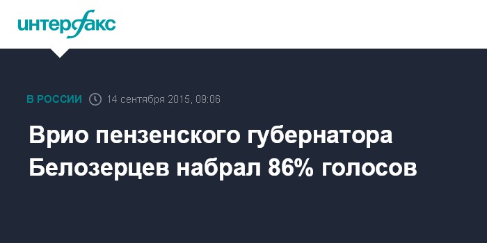Москва. 14 сентября. INTERFAX.RU - На выборах губернатора Пензенской области, по результатам обработки 100% протоколов, с результатом 86,05% голосов побеждает врио главы региона, представитель "Единой России" Иван Белозерцев, сообщили "Интерфаксу" в областном избиркоме.