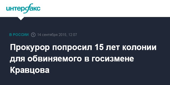 Москва. 14 сентября. INTERFAX.RU - Прокурор попросил 15 лет лишения свободы для обвиняемого в госизмене Геннадия Кравцова, сообщил "Интерфаксу" в понедельник адвокат подсудимого Иван Павлов.