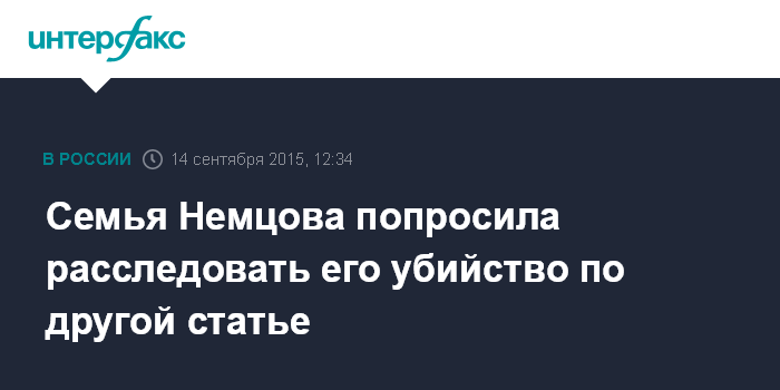 Москва. 14 сентября. INTERFAX.RU - Представители семьи застреленного в феврале оппозиционера Бориса Немцова ходатайствуют перед следствием о квалификации преступления как убийства государственного деятеля.