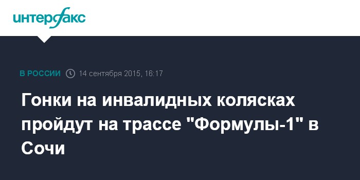 Москва. 14 сентября. INTERFAX.RU - В Cочи 24 сентября на трассе "Формулы-1" впервые в России пройдут международные соревнования по гонкам на колясках, сообщили агентству "Интерфакс" в пресс-службе курорта в понедельник.