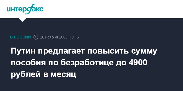 Москва. 20 ноября. INTERFAX.RU - Премьер-министр РФ Владимир Путин предложил увеличить с 1 января будущего года максимальный размер пособия по безработице на 1500 рублей до 4900 рублей в месяц.