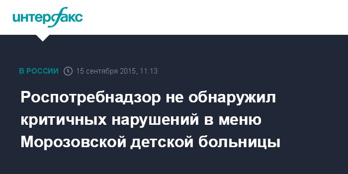 Москва. 15 сентября. INTERFAX.RU - Роспотребнадзор не выявил серьезных нарушений качества питания в Морозовской детской больнице в Москве, сообщила журналистам глава ведомства Анна Попова