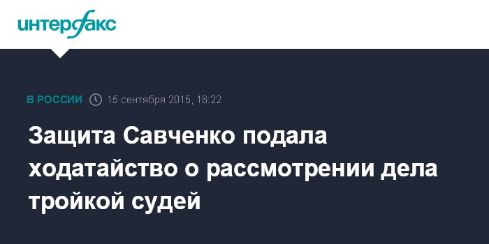 Москва. 15 сентября. INTERFAX.RU - Адвокат Надежды Савченко подал ходатайство в суд о рассмотрении этого дела коллегией из трех судей, сообщил защитник подсудимой украинки Марк Фейгин.