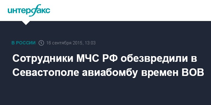 Москва. 16 сентября. INTERFAX.RU - Пиротехники ГУ МЧС России по Севастополю в среду обезвредили на площадке строительства ТЭС-2 немецкую фугасную авиабомбу SС-500 времен Великой Отечественной войны, сообщила пресс-служба ГУ МЧС РФ по Севастополю.