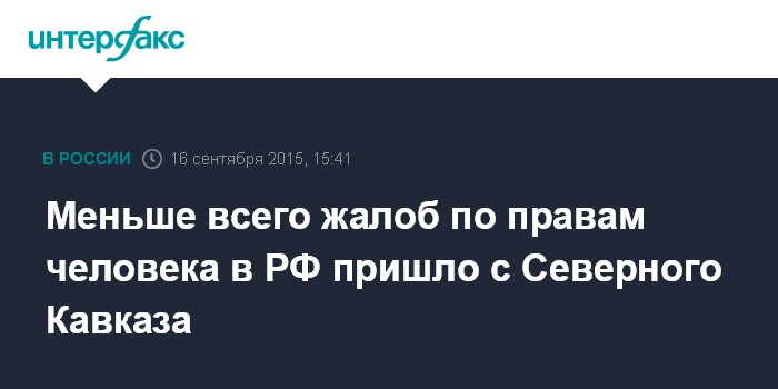 Москва. 16 сентября. INTERFAX.RU - Из Северо-Кавказского федерального округа в аппарат российского уполномоценного по правам человека поступило лишь 3% от общего количества жалоб по стране, сообщила омбудсмен РФ Элла Памфилова.