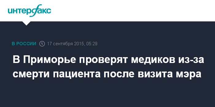 Москва. 17 сентября. INTERFAX.RU - Прокуратура и следственные органы Приморья приступили к проверке появившейся в интернете информации о том, что в больнице Артема из-за визита главы города Владимира Новикова медики не оказали должного внимания 67-летнему пациенту и тот скончался.