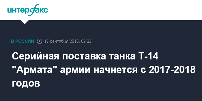 Москва. 17 сентября. INTERFAX.RU -Массовая поставка российской армии новейших танков Т-14 "Армата" начнется на рубеже 2017-2018 годов, сказал "Интерфаксу" заместитель гендиректора НПК "Уралвагонзавод" (УВЗ) Вячеслав Халитов.