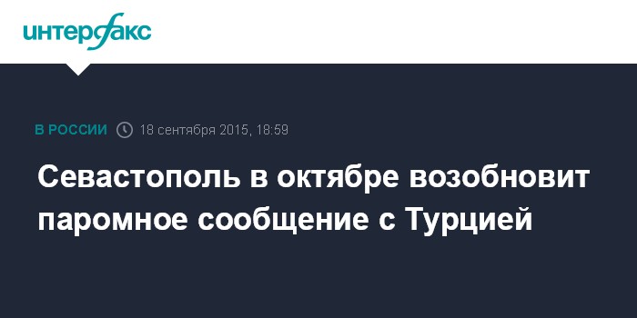 Москва. 18 сентября. INTERFAX.RU - Грузопассажирское паромное сообщение между Севастополем и Турцией может быть восстановлено в октябре текущего года, сообщил губернатор Севастополя Сергей Меняйло.