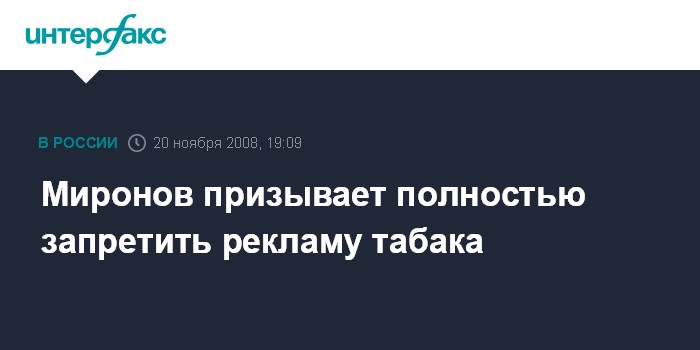 "Правительство и законодатели должны остановить лоббистов, "сигаретных королей" и нужно не на словах, а на деле запретить рекламу табачных изделий. Реклама табакокурения на телевидении запрещена, однако она процветает в других форматах в торговых сетях и в интернете", - сказал Миронов "Интерфаксу".
