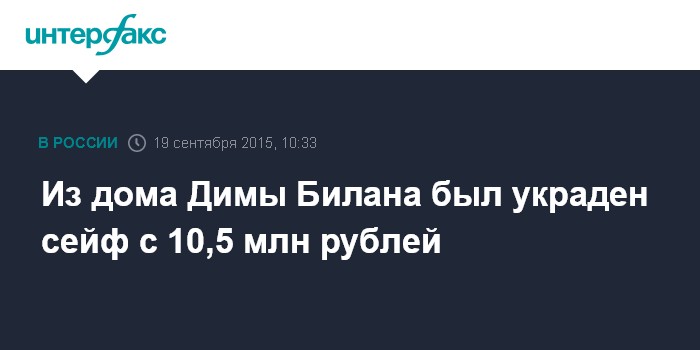 Москва. 19 сентября. INTERFAX.RU - Сумма ущерба от кражи из дома певца Димы Билана в новой Москве составила около 10,5 млн рублей, сообщил "Интерфаксу" в субботу источник в правоохранительных органах.
