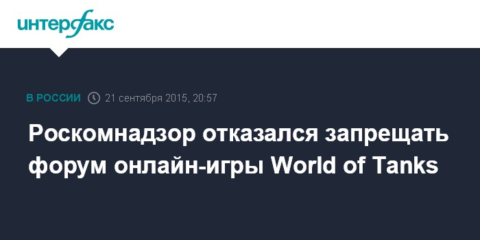 Москва. 21 сентября. INTERFAX.RU - Роскомнадзор отклонил заявку на внесение в единый реестр запрещенной информации одной из страниц форума многопользовательской онлайн-игры World of Tanks.