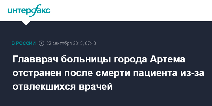 Москва. 22 сентября. INTERFAX.RU - Главврач больницы №1 города Артема, где ранее скончался пенсионер якобы из-за того, что медики отвлеклись на визит мэра Владимира Новикова, отстранен от занимаемой должности.