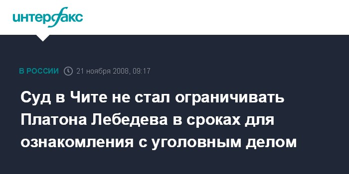 Москва. 21 ноября. INTERFAX.RU - Ингодинский районный суд города Читы отказал в ходатайстве следствия на ограничение до 15 декабря 2008 года срока ознакомления с материалами уголовного дела адвокатам и бывшему руководителю МФО "МЕНАТЕП" Платону Лебедеву.