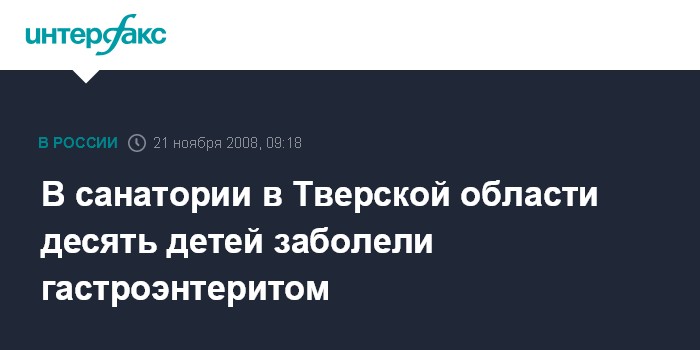 Москва. 21 ноября. INTERFAX.RU - Из санатория "Игуменка" в Конаковском районе Тверской области в среду госпитализированы десять детей с диагнозом гастроэнтерит, сообщили в пятницу "Интерфаксу" в региональном управлении Роспотребнадзора. "Состояние детей оценивается как средней и легкой степени тяжести. Сейчас они находятся в областной детской больнице, где им оказывается необходимая медпомощь", - сказали в управлении.