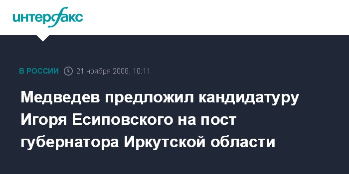 Москва. 21 ноября. INTERFAX.RU - Президент России Дмитрий Медведев внес на рассмотрение Законодательного Собрания Иркутской области кандидатуру Игоря Есиповского для наделения его полномочиями губернатора Иркутской области, сообщает в пятницу пресс-служба Кремля.