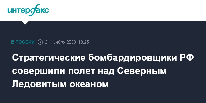 Москва. 21 ноября. INTERFAX.RU - Два стратегических бомбардировщика Ту-95МС осуществили девятичасовой полет на воздушное патрулирование над Северным Ледовитым океаном, рассказал "Интерфаксу-АВН" в пятницу помощник главкома ВВС подполковник Владимир Дрик.