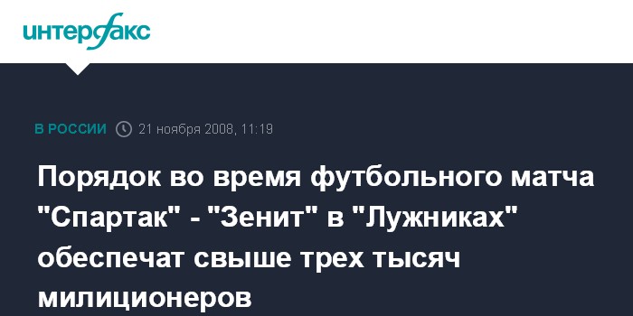 Москва. 21 ноября. INTERFAX.RU - Охрану правопорядка во время матча чемпионата России по футболу между командами "Спартак" (Москва) и "Зенит" (Санкт-Петербург), который состоится в субботу на стадионе "Лужники", будут обеспечивать более 3 тысяч сотрудников милиции и военнослужащих Внутренних войск, сообщили "Интерфаксу" в управлении информации и общественных связей ГУВД столицы в пятницу.