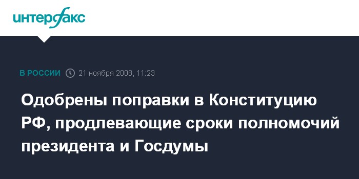 Москва. 21 ноября. INTERFAX.RU - Государственная Дума одобрила в третьем, окончательном чтении внесенные президентом РФ Дмитрием Медведевым поправки в Конституцию РФ, продлевающие сроки полномочий главы государства и парламента.
