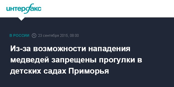 Москва. 23 сентября. INTERFAX.RU - Комиссия по чрезвычайным ситуациям Кировского муниципального района Приморья решила запретить прогулки в детских садах и школах в связи с угрозой нападения медведей.