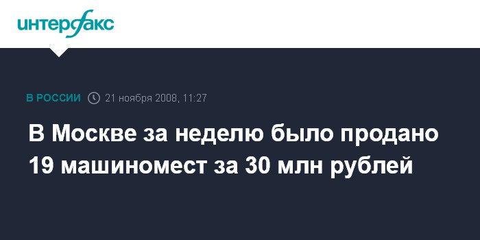 Москва. 21 ноября. INTERFAX.RU - В течение последней недели в столице было продано 19 машиномест, сообщили "Интерфаксу" в пятницу в департаменте имущества города.