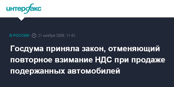 Москва. 21 ноября. INTERFAX.RU - Госдума на пленарном заседании в пятницу приняла во втором и третьем чтениях поправки в Налоговый кодекс РФ, касающиеся уплаты НДС при продаже подержанных автомобилей.