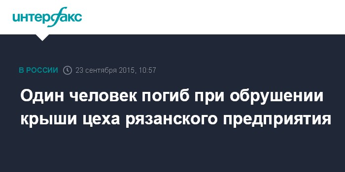Москва. 23 сентября. INTERFAX.RU - При обрушении кровли в цехе на территории завода "Тяжпрессмаш" в Рязани погиб человек, сообщили "Интерфаксу" в пресс-службе УМВД по Рязанской области.