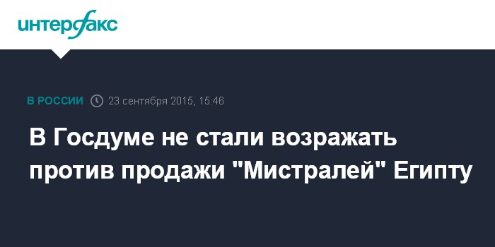 Москва. 23 сентября. INTERFAX.RU - В комитете Госдумы по обороне считают, что Россия одобрит продажу Францией непоставленных в Россию вертолетоносцев "Мистраль" Египту.