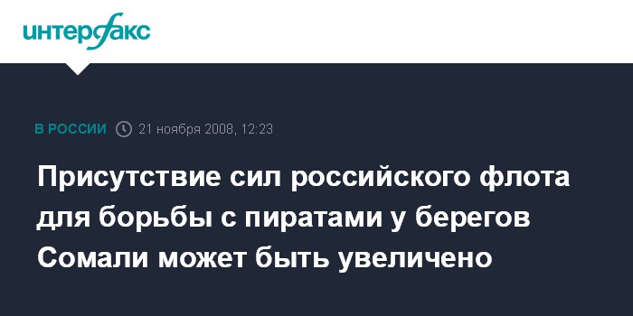 Москва. 21 ноября. INTERFAX.RU - Россия планирует нарастить военное присутствие у берегов Сомали, где активизировались пираты, заявил "Интерфаксу-АВН" в пятницу высокопоставленный военно-дипломатический источник в Москве.