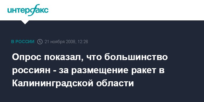 Москва. 21 ноября. INTERFAX.RU - Большинство россиян (62%) одобряют намерение властей страны развернуть в Калининградской области ракетный комплекс "Искандер", если США продолжат строительство объектов противоракетной обороны (ПРО) в Чехии и Польше.