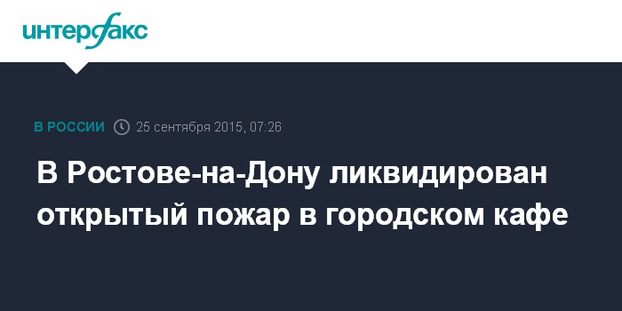 Москва. 25 сентября. INTERFAX.RU - В Ростове-на-Дону пожарные ликвидировали открытое горение в городском кафе, сообщили "Интерфаксу" в экстренных службах региона.