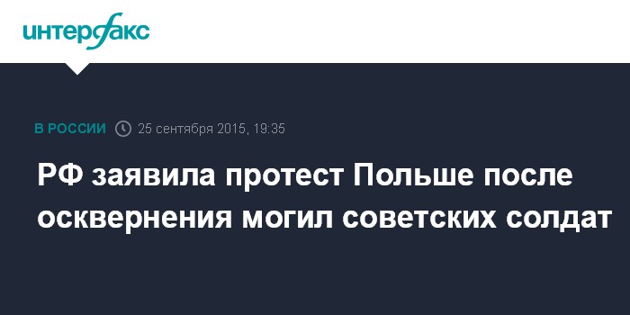Москва. 25 сентября. INTERFAX.RU -- Посол Польши в Москве Катажина Пелчиньская-Наленч в пятницу была вызвана в МИД России, где ей был заявлен решительный протест в связи с осквернением неизвестными вандалами более 50 надгробных плит и памятников на могилах советских солдат на кладбище в городе Милейчице (Подляское воеводство), где похоронено около 1600 воинов Красной Армии, павших на польской земле во время Второй мировой войны.