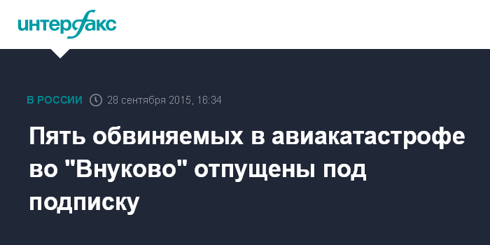 Москва. 28 сентября. INTERFAX.RU - Пятеро фигурантов дела о крушении самолета "Фалькон" в московском аэропорту "Внуково" отпущены под подписку о невыезде.