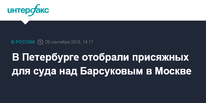 Как сообщил "Интерфаксу" во вторник адвокат Барсукова Сергей Афанасьев, в Петербурге отобраны 40 человек, которые согласились ехать на процесс в Москву. "Теперь в Москве 21 октября из этого числа отберут 24 присяжных, в том числе 12 запасных", - сказал он.