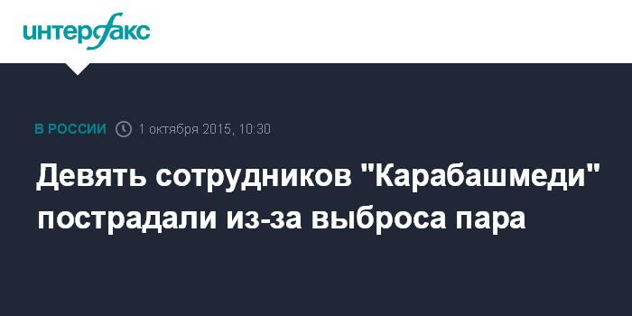 Москва. 1 октября. INTERFAX.RU - В четверг на медеплавильном предприятии "Карабашмедь" в Челябинской области в металлургическом цеху произошел выброс пара, пострадали девять человек.