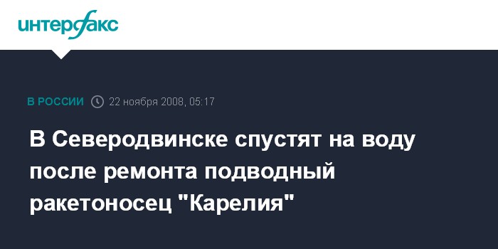 Северодвинск. 22 ноября. ИHТЕРФАКС-АВН - ОАО "Центр судоремонта "Звездочка" в субботу планирует вывести из эллинга ракетный подводный крейсер стратегического назначения К-18 "Карелия", сообщает пресс-служба предприятия.
