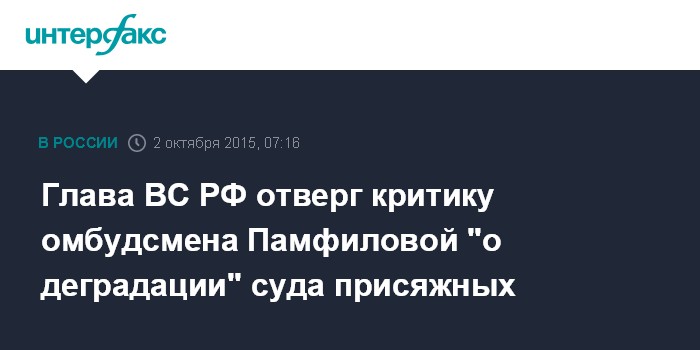 Москва. 2 октября. INTERFAX.RU - Председатель Верховного суда РФ Вячеслав Лебедев в ответ на критику омбудсмена Эллы Памфиловой о "деградации" института суда присяжных высказался за расширение списка дел для рассмотрения в таком формате.