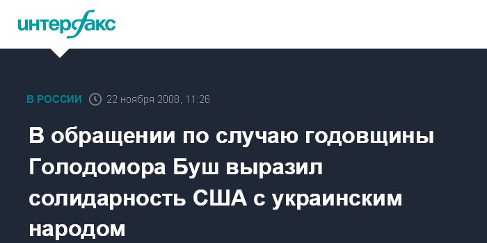 Москва. 22 ноября. INTERFAX.RU - Президент США Джордж Буш обратился к украинскому народу по случаю 75-летней годовщины голодомора 1932-33 годов, сообщает пресс-служба главы украинского государства в субботу.