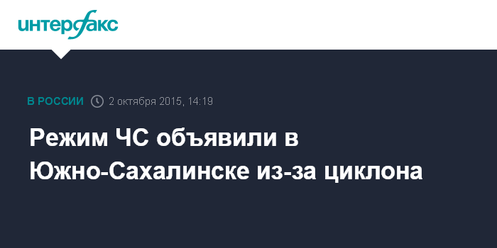 Москва. 2 октября. INTERFAX.RU - Режим чрезвычайной ситуации введен в Южно-Сахалинске, Корсаковском и Долинском районах Сахалина в связи с прохождением мощного циклона и его последствиями, сообщает пресс-служба областного правительства.
