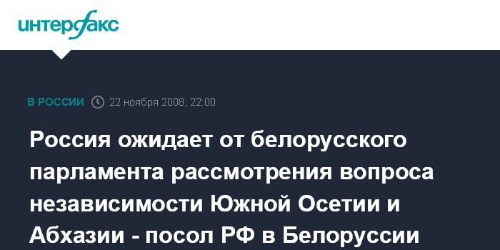 Минск. 22 ноября. ИНТЕРФАКС-ЗАПАД - Россия ожидает, когда белорусский парламент рассмотрит вопрос о признании независимости Южной Осетии и Абхазии, заявил в интервью агентству "Интерфакс-Запад" Чрезвычайный и Полномочный посол России в Беларуси Александр Суриков.