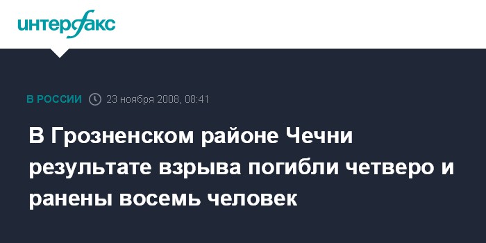 Ростов-на-Дону. 23 нобяря. ИНТЕРФАКС-ЮГ - В Чечне в результате взрыва в поселке Садовый Грозненского района погибли четыре человека, в том числе замкомандира полка УВО при МВД республики подполковник милиции Лечо Толхадов, сообщили агентству "Интефакс-Юг" в штабе объединенной группировки войск на Северном Кавказе