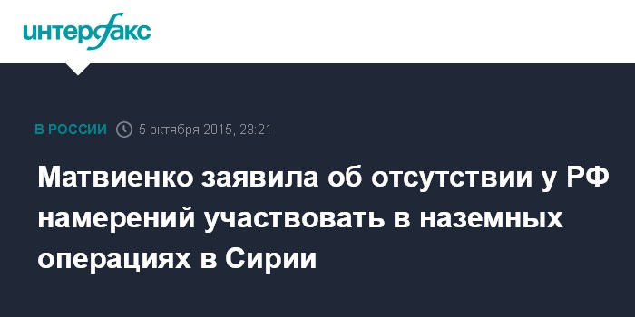 Москва. 5 октября. INTERFAX.RU - Российские войска не будут участвовать в наземных операциях в Сирии, заявила в понедельник спикер Совета Федерации РФ Валентина Матвиенко.