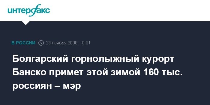 Банско (Болгария). 23 ноября. INTERFAX.RU - Зимой 2008-09 болгарский горнолыжный курорт Банско впервые рассчитывает принять миллион гостей, из них не менее 160 тыс. - россиян, сообщил мэр общины Банско Александр Краваров.
