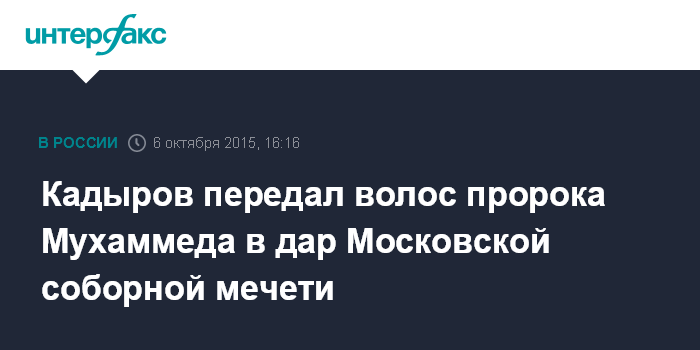Москва. 6 октября. INTERFAX.RU - В центральной мечети Чеченской республики "Сердце Чечни" состоялась церемония торжественной передачи в дар Московской соборной мечети священной для мусульман реликвии - волоса пророка Мухаммеда.