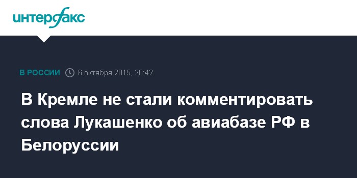 Москва. 6 октября. INTERFAX.RU - В Кремле пока не комментируют прозвучавшее во вторник заявление президента Белоруссии Александра Лукашенко по вопросу о размещении российской авиабазы, заявил пресс-секретарь главы российского государства Дмитрий Песков.