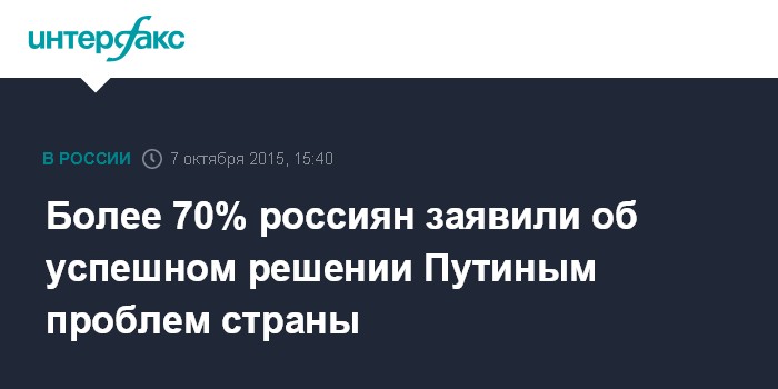 Москва. 7 октября. INTERFAX.RU - Доверие россиян к президенту РФ Владимиру Путину связано с тем, что он "успешно и достойно решает проблемы страны" (37%), кроме того, они надеются, что он сможет и в дальнейшем справляться с проблемами (36%), считают россияне, опрошенные социологами.