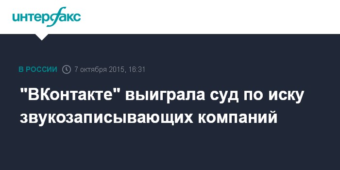 Москва. 7 октября. INTERFAX.RU - Арбитражный суд Санкт-Петербурга и Ленинградской области встал на сторону социальной сети "ВКонтакте" в споре, который начался с исков крупных звукозаписывающих компаний Sony Music Russia, Universal Music Russia и Warner Music UK о нарушении авторских прав на музыку, сообщает пресс-служба социальной сети в среду.