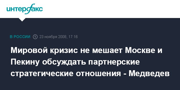 Мировой кризис не мешает Москве и Пекину обсуждать партнерские стратегические отношения - Медведев