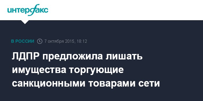 Москва. 7 октября. INTERFAX.RU - Лидер ЛДПР Владимир Жириновский внес в Госдуму проект закона, предлагающий конфисковать имущество крупных торговых сетей в случае продажи санкционных продуктов