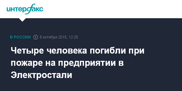 Москва. 8 октября. INTERFAX.RU - Четыре человека погибли в результате пожара в одном из цехов предприятия в подмосковной Электростали, сообщили "Интерфаксу" в пресс-службе ГУ МВД по области.