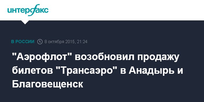 Москва. 8 октября. INTERFAX.RU - "Аэрофлот"с 8 октября возобновил продажу билетов на рейсы "Трансаэро" из Москвы в Анадырь и Благовещенск, говорится в письме "Аэрофлота", адресованном агентам и представителям авиаперевозчика в РФ (с копией ознакомился "Интерфакс").